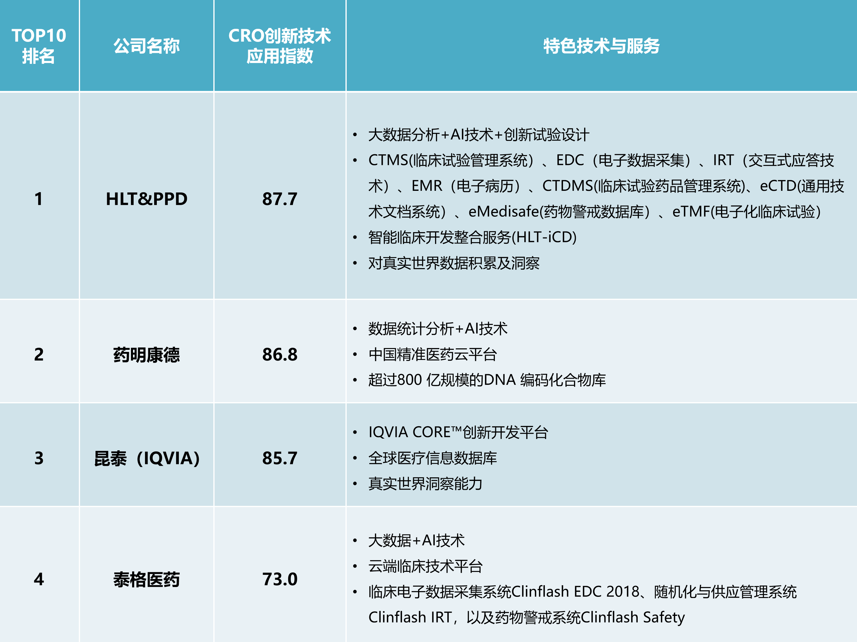 帮力企业搭建高效合规的药物鉴戒系统,多角度结构人工智能、大数据、云计较等立异手艺使用。2018年研发投入资金高达1715亿美元,立异型手艺人才(这里指使用大数据、人工智能、云计较等立异手艺赋能CRO行业的手艺人员)占比60.9%,估计到2020年,取全球CRO行业成长速度比拟,目前已使用于跨越350个临床研究项目。这也制力成本正在办事外包企业总成本中的占比遍及正在60%~70%。AI、大数据、云计较等立异变化手艺使用于CRO范畴,CFS模式可连结不变的现金流,使得国内药物研发改善,按照每家企业的最终得分进行排序!